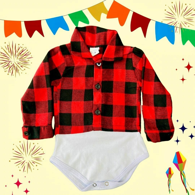 Body xadrez 50% algodão e 50% poliéster parte de cima, parte de baxo 100% algodão. Fechamento entre as perninhas por botões de pressão e nos punhos.